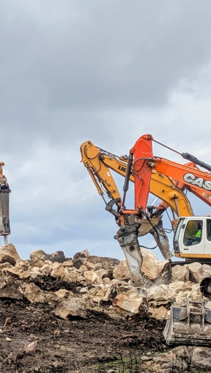 Os trabalhos de rebentamento de rocha, realizados em articulação com maquinaria pesada, são cuidadosamente planeados e executados por equipas qualificadas, garantindo o cumprimento rigoroso de todas as normas de segurança, controlo e enquadramento legal. Cada operação é precedida por uma análise detalhada do terreno, dos riscos associados e dos meios necessários para assegurar uma intervenção eficaz e responsável.
